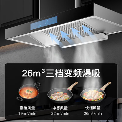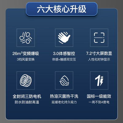 隔空挥手启动,不沾油渍更卫生,拢烟设计控烟范围广泛,让厨房干净无烟,高转速吸排功能,快速排烟低噪运行。