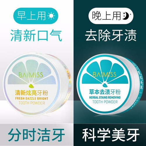 早晚分用的牙粉组合,早上能够清除难闻的异味,让口气更清新,而晚上则可以利用草本进行去渍美白,让牙齿洁白有光泽。