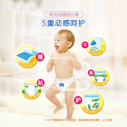 设计三核锁水芯,快速瞬吸,为宝宝带来持久的干爽体验。打造高弹力腰围,贴合腰身,不易脱落,宝宝更爱用。