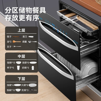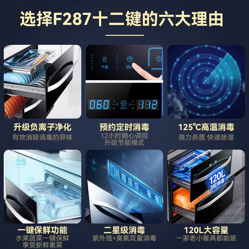 这款具有120L大容量,可以容纳大量餐具,轻松驾驭多口之家的使用。另外负离子净化,有效消除异味,柜内空气更清新。