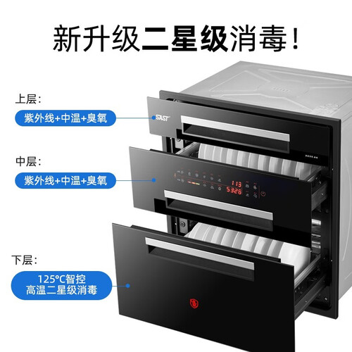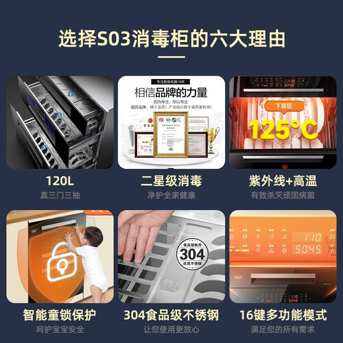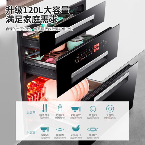 分层杀菌,根据餐具不同选择合适的消毒方式。大容量三层设计,多种餐具有序摆放,提高空间利用率。智能防烫提醒,设计人性化。
