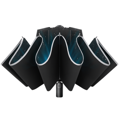 伞布部分运用了荷叶拒水工艺,一甩即干。采用了反向收合设计,湿伞的伞面可内收,雨天也能随意放置。采用天使环设计,可多方位反射光线。