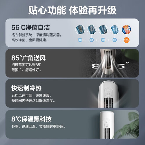 采用大闭合导风板扫风结构设计,可以实现宽幅送风,使气流分布更均匀。采用制热防冷风设计,可以实时监测送风温度,防止冷风。