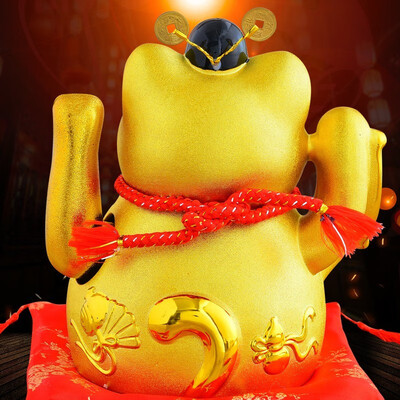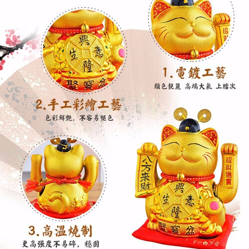 笑成弯月的眼睛、摇手相迎的猫爪让猫咪活灵活现,观赏心情愉悦。通体金灿灿,铜钱、元宝等立体雕花生活气息浓厚,倍感亲切。