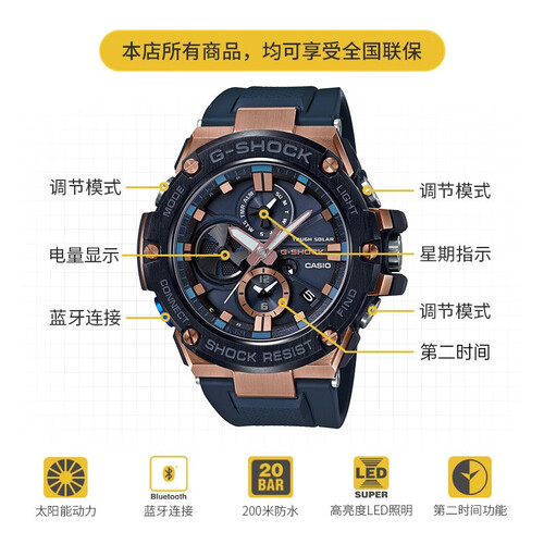 可通过蓝牙与手机APP连接,在手机中操控腕表的一些特定程序,简单方便耗能低。闹铃功能,到时自动提醒,避免错过重要事情。