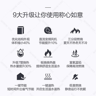 升级了7管换热系统,能提升30%的热水量,快速出水畅快洗澡。设计了三分段的燃烧系统,保证夏天不烫冬天不凉。