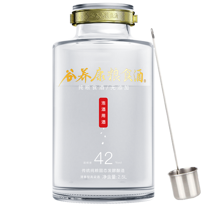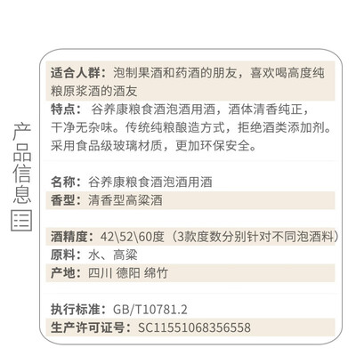 固态发酵真粮食酒,不含酒类添加剂,可直接与药材、水果相融,微甘馥雅营养富足。大口径玻璃瓶体,方便投料倒酒,细致周到。