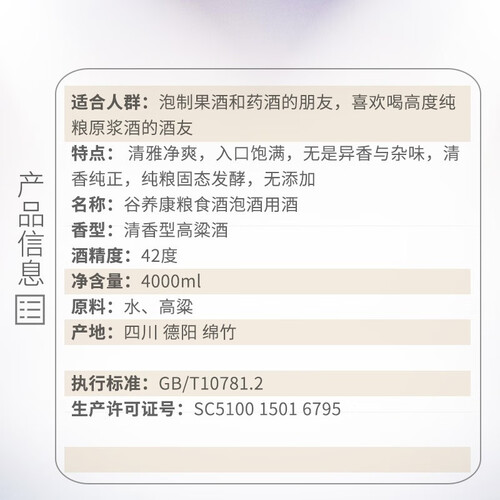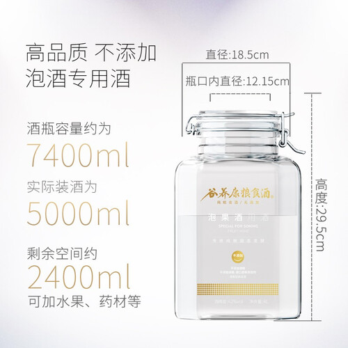 转为泡酒而设计,里面除粮食外无任何添加,纯正度非常高。大口径环保玻璃瓶身,剩余空间可直接放入药材,投料更加方便。