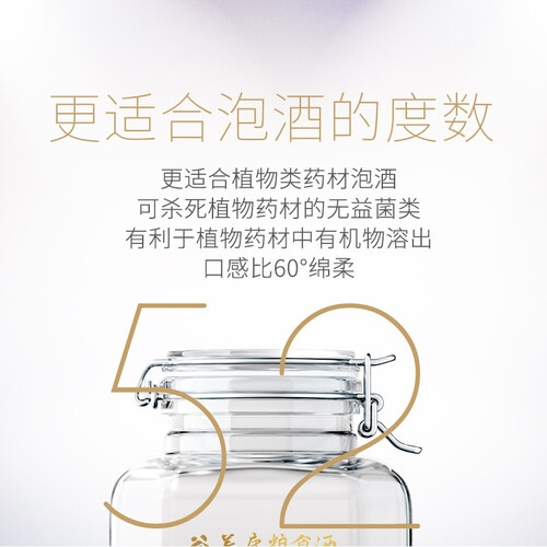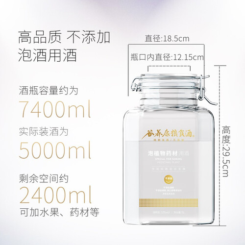 优选纯粮酿制,无添加品质好,可直接放入药材、水果泡酒。采用环保玻璃瓶身,内里酒质清晰可见,同时材质环保可回收。