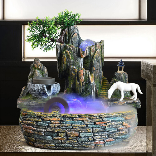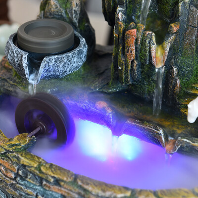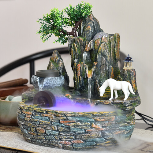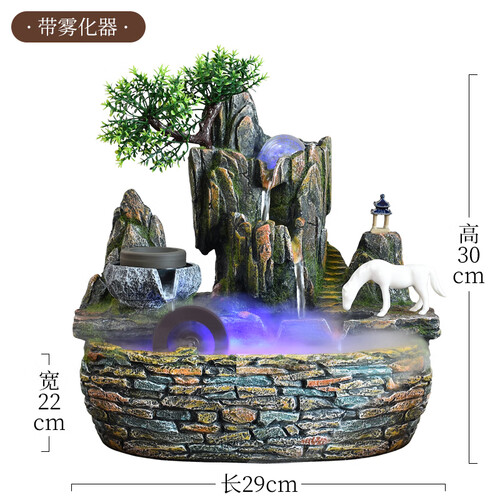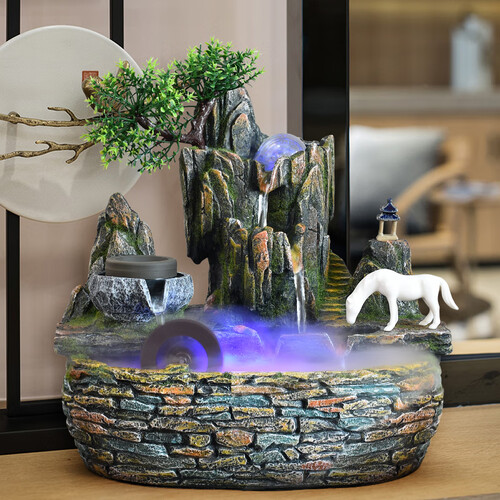 优质树脂材质,健康环保,木质坚硬有韧性,长时间使用也不会开裂。灯光转球,将流水点缀的熠熠生辉,炫彩亮丽。