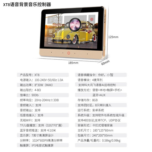 AI语音智控设计,智能语音操作,秒速响应指令,操作便捷。四分区音量控制,配备7英寸高清大屏幕,画质清晰逼真,点触灵敏。