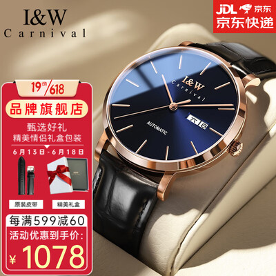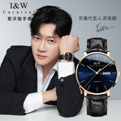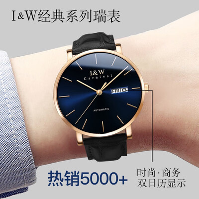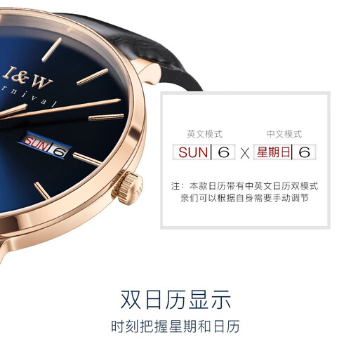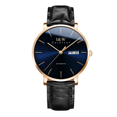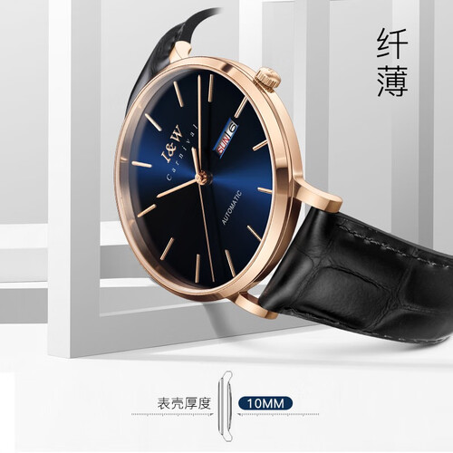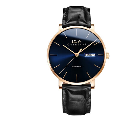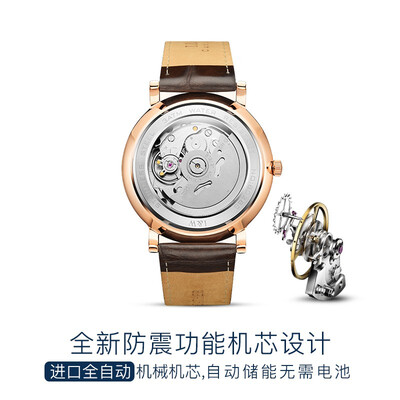深沉的蓝色镜面与玫金表壳相结合,沉静且华贵,尽显成熟男人的绅士风度。表带采用意大利进口牛皮,皮质柔软有韧性。