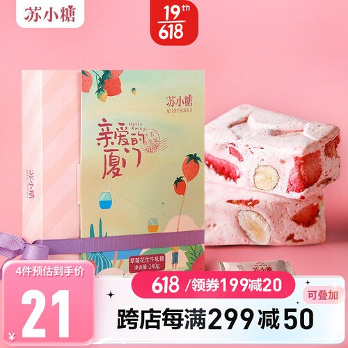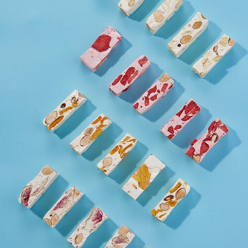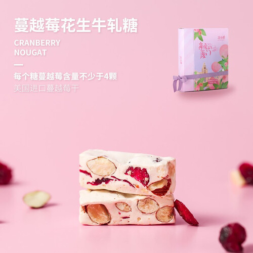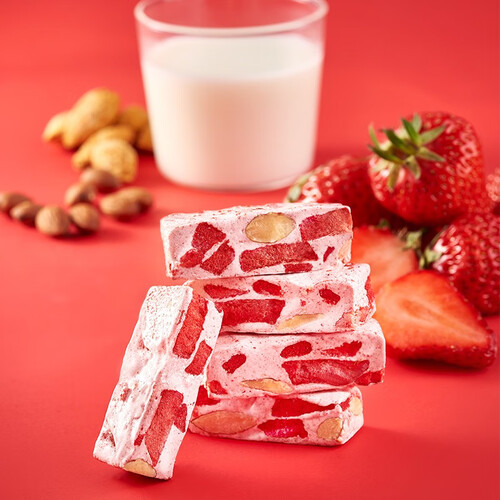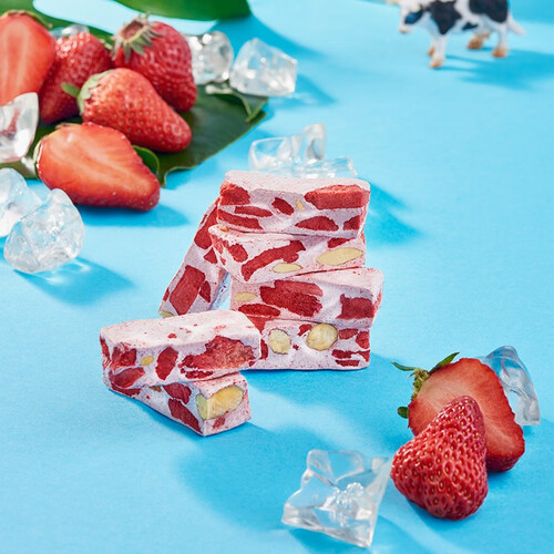 严格挑选牧场鲜奶,搭配草莓和花生制作牛轧糖,糖果洁白鲜亮,轻嚼柔滑细腻。