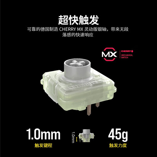 德国原厂的樱桃轴,让这款机械键盘能够带来无段落感的快速响应。搭配灵动版的短行程轴体设计,能够带来全天的舒适感受。