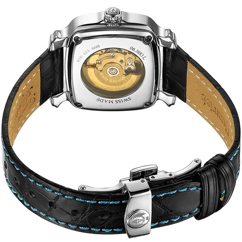 白色油压菊花纹表盘,点缀上蓝色指针,碰撞出别样的风采,独特美观。表圈处对称镶嵌了闪耀钻石,增添细节美感。