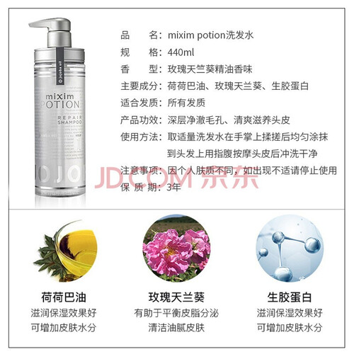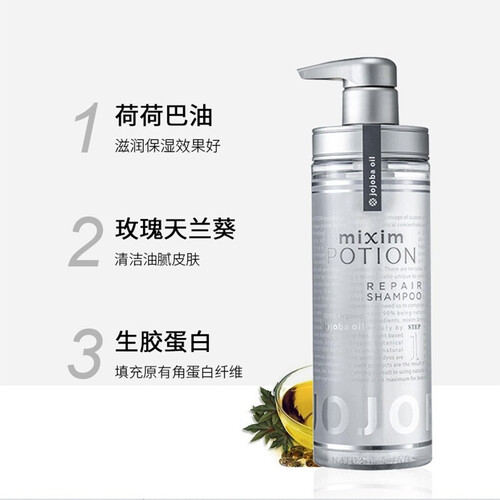 精选多种护发物质,进行混合搭配,带来强效护发能力。特别添加荷荷巴油原液,有效提升发丝弹性,光滑十足。