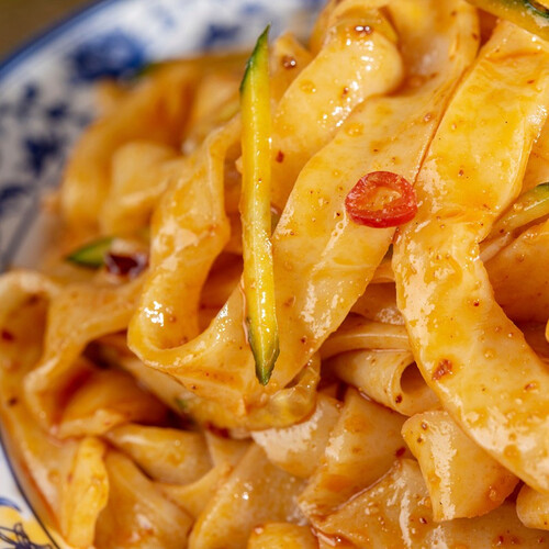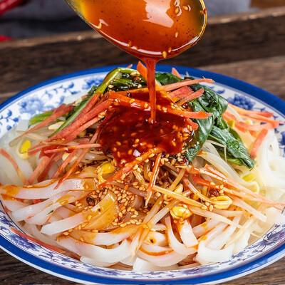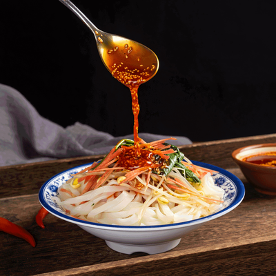 精选优质大米,坚持传统工艺制作,口感柔软中不失劲道。来自汉中本地的压榨菜籽油,制成的辣椒油香气四溢,食欲大增。