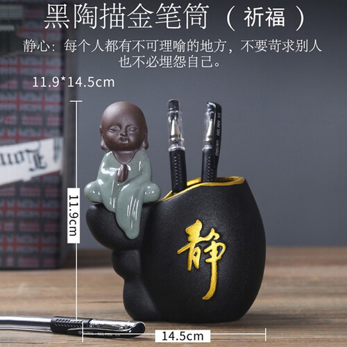 笔筒上面坐着一位小和尚,其形象生动逼真,默默诵经,让你远离浮躁;笔筒口部宽阔,可存放更多小物品,办公居家两相宜。