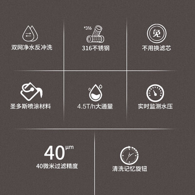 搭载记忆拨盘,方便记录下清洗时间,避免遗忘导致过滤效果下降。拥有4.5T大通量,满足全屋的净水需要,洁净无处不在。
