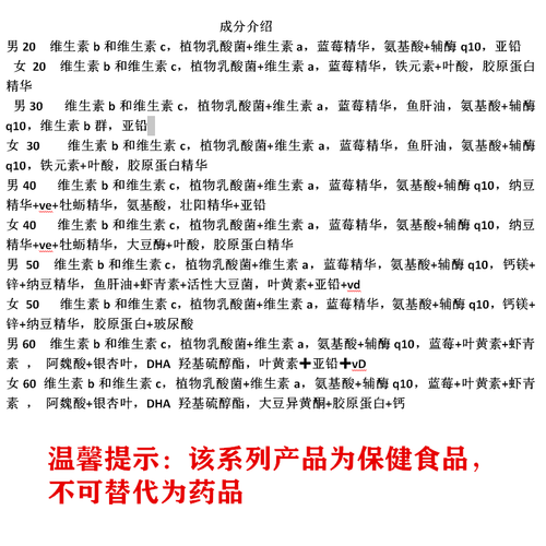 专为40代男士研制,富含多种营养成分。使用独立小袋包装,一天一袋,服用和携带都很方便。