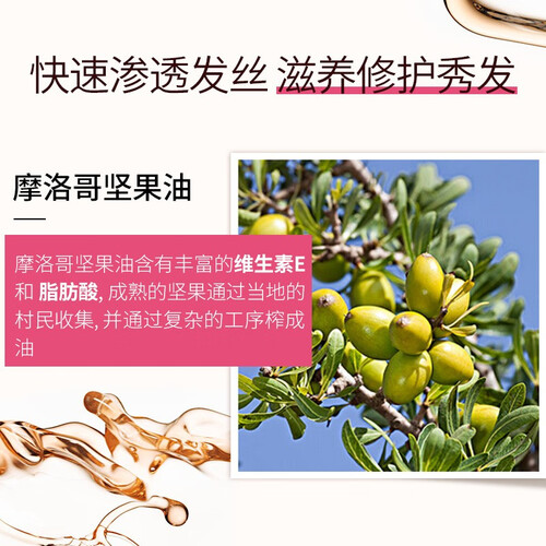 源自摩洛哥坚果的奇迹,搭配植物精粹,富含秀发所需营养物质,适合各种发质,有效抚平毛躁干枯,修护损伤发质。