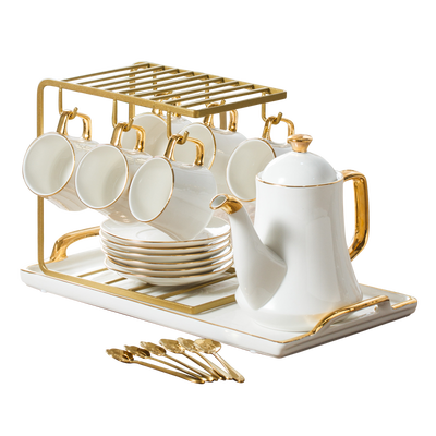 达沃咖啡杯套装带铁架设计,可以很好的收纳杯具,清洗悬挂也有利于沥水。舒适手柄,符合人体学结构。金边描绘,增加其美观感。