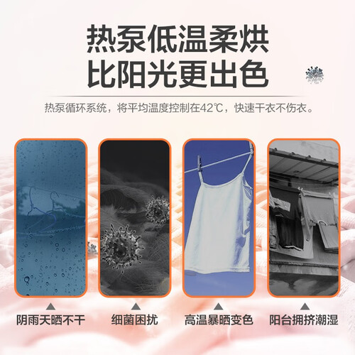 快速烘干衣物,不惧梅雨雾霾天气,不需晾晒空间。精准感知衣物湿度,衣干即停,防止过度烘干伤衣。