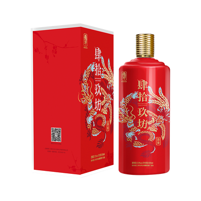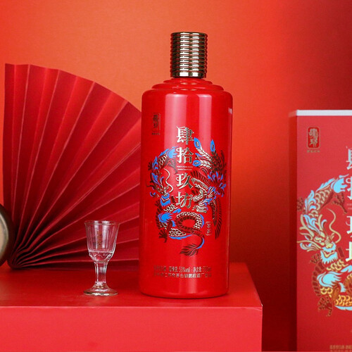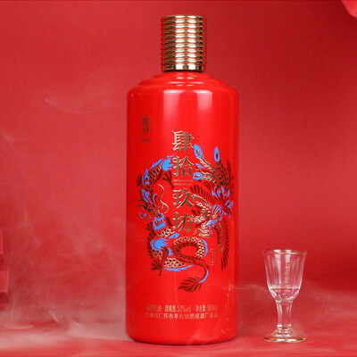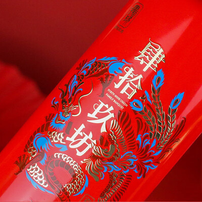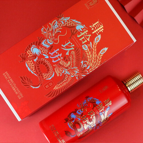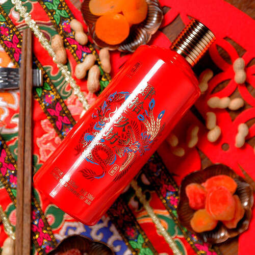 “龙凤呈祥”喜宴用酒,瓶身设计非常具有喜庆感,大红的底色配以高贵的金色,非常豪华高端。烫金设计的圆滑瓶盖,更具时尚感。
