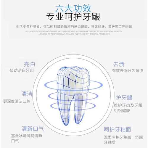 采用含氟配方,可强化牙釉质,防止牙齿被侵蚀,预防蛀牙龋齿。添加薄荷精华,口腔清凉劲爽,维持清新口气。