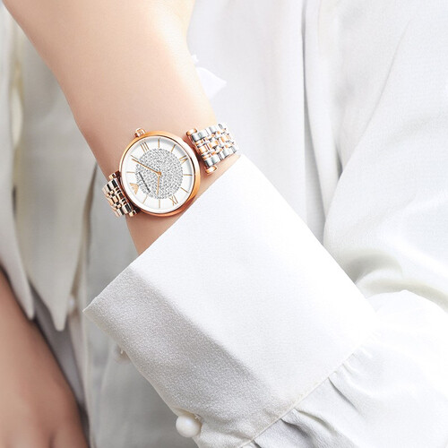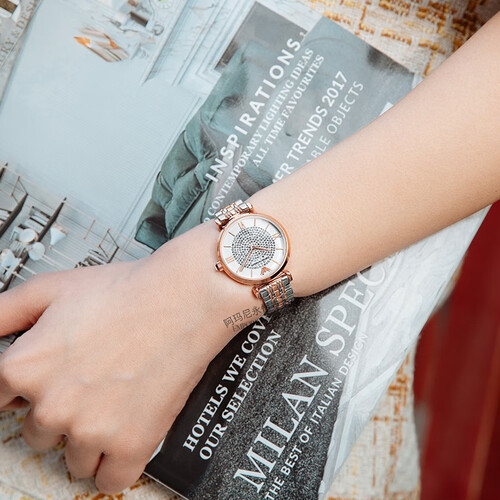 经典圆盘设计,利落易搭配,并缀以水钻,精致惹眼,悄然扮靓丽人腕间时尚。配间金色钢带,时尚吸睛之余质地坚韧,久戴不易断裂。