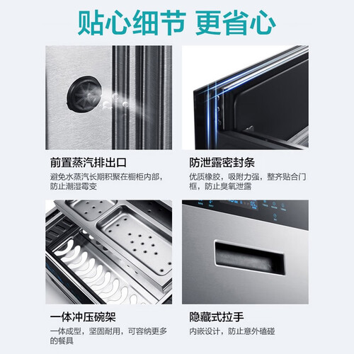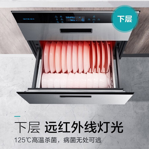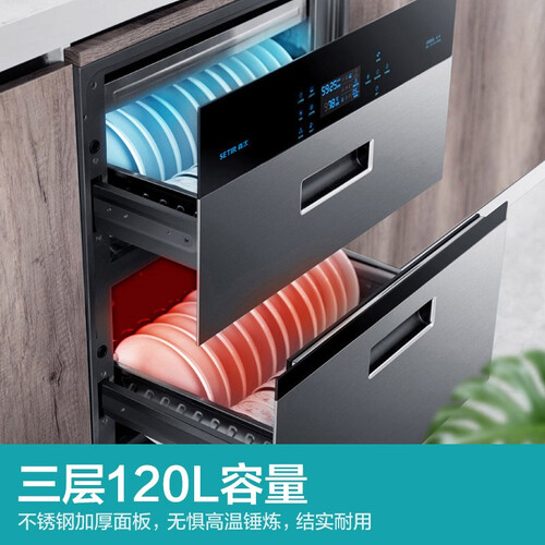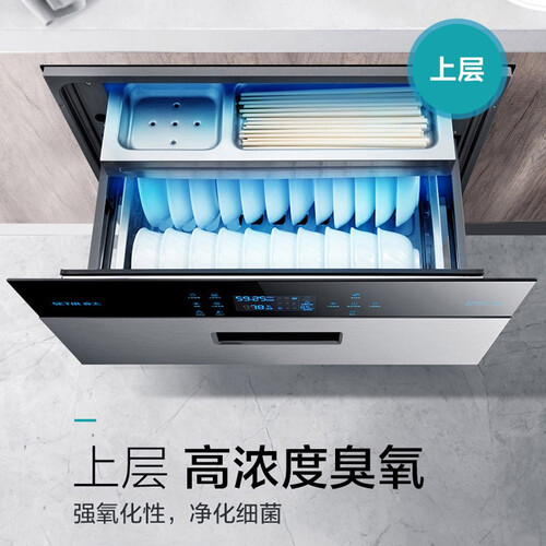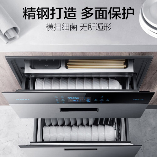 三层抽屉布局更加合理,根据餐具材质进行划分消毒区域,保证餐具不变形不受潮,超大容量可以满足6人餐具同时消杀。