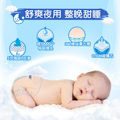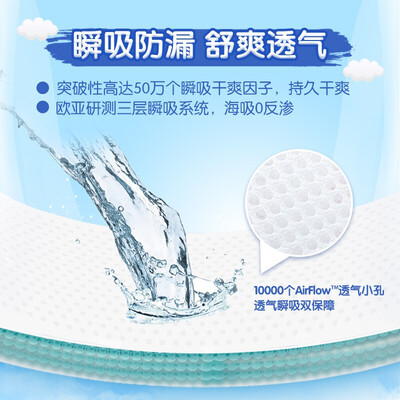 拥有三层瞬吸系统,海量吸收液体,不会返渗和漏液,让宝宝小屁屁时刻保持干爽。超薄的复合芯,具有良好的透气性。