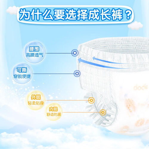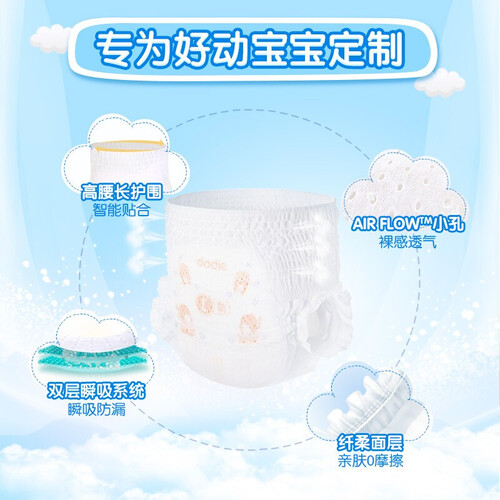根据腰腹胯三段式剪裁制成,更贴合宝宝身型,穿感自然舒适。内置悬浮芯体,5次尿量轻松无压力,更得宝妈芳心。