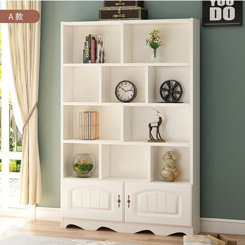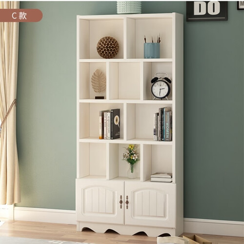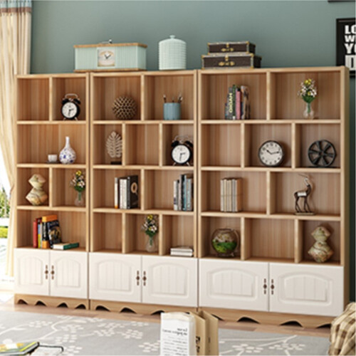 书架加入了造型柜门设计,美观同时也增加了隐私度。选用莫干山实木生态板材,无缝连接稳定性能佳,摆放更多书本无压力。