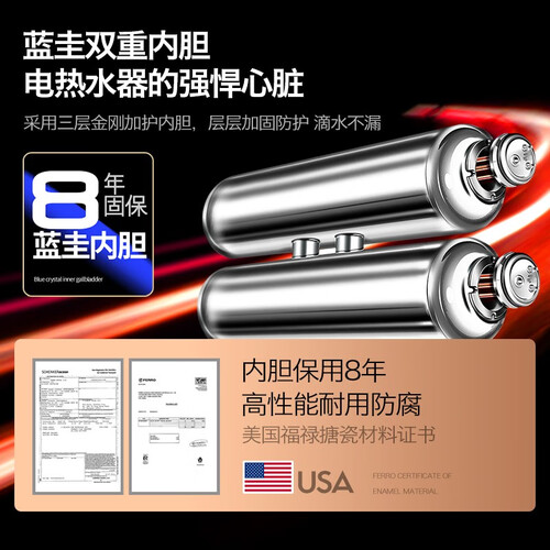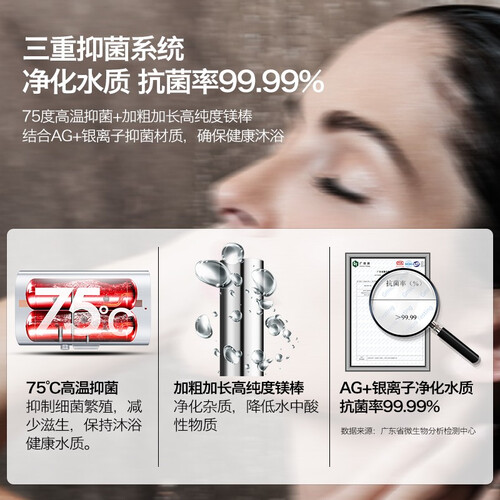 采用双下潜式不锈钢加热管,加热快速,耐高温抗腐蚀,经久耐用。三重健康系统,抑菌内胆细菌滋生,净化水质,健康沐浴。
