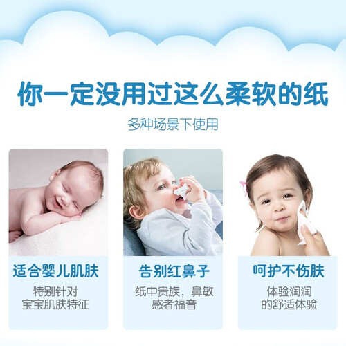 甄选原生木浆,健康自然;采用多分子保湿技术,能让水分待在纸巾里;搭配全新的交织工艺,即使用力撕扯也不易扯断。