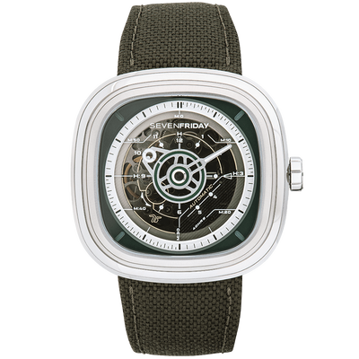 采用针扣帆布表带,可自由调节腕间松紧,佩戴透气舒适。指针与时针覆有夜光涂层,在夜间能照亮盘面,读时更便捷。