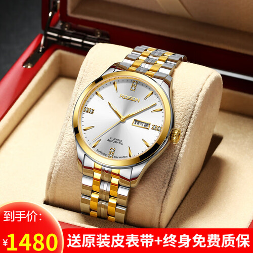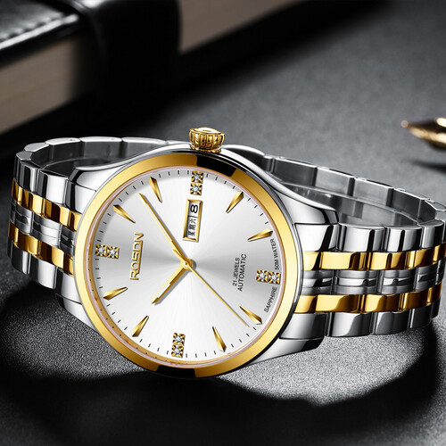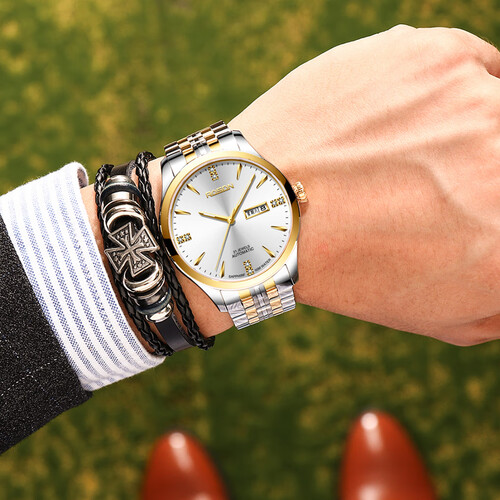 间金白面色彩设计,色彩对撞感满满,充满吸睛效果,同时还富有商务范。双钻刻度设计,充满大气感,上腕突出绅士感。