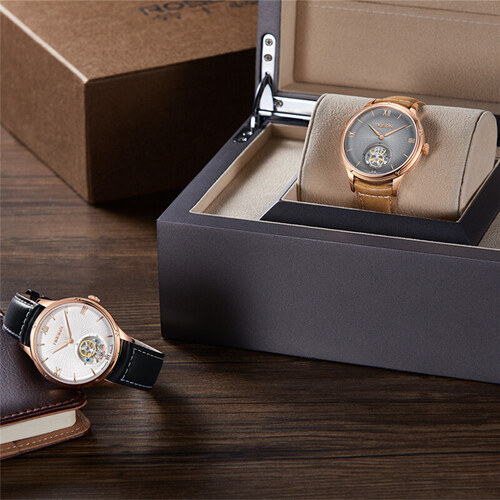 真皮材质的表带,质地很柔软,触感细腻顺滑。同时表盘加入了镂空的元素,空间感十足,非常美观。