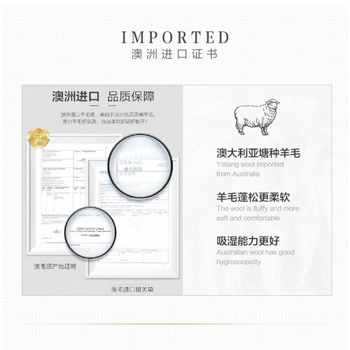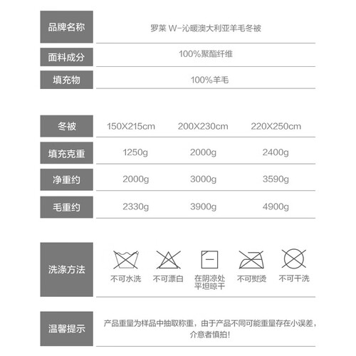 精选优质的进口天然羊毛填充,蓬松柔软恒温吸湿,能为您带来温润舒适的睡眠感,配以高密度的单层防绒面料,亲肤暖和舒爽。