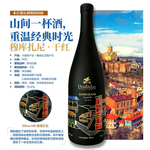瓶身描绘城市街景,背景中街道蜿蜒向上,侧面反映鲁吉亚地貌,增添灵动美,搭配圭弗利陶罐酿制,口感更香滑。