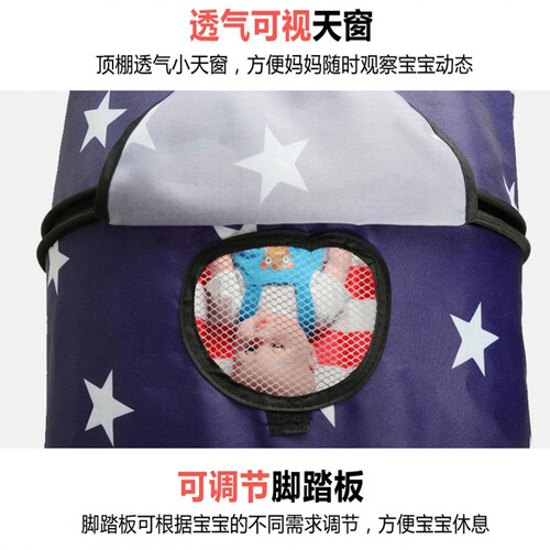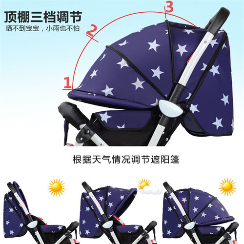 三种可调的顶棚设计,可以根据天气情况自行调节,满足多样化需求。推车搭载360度旋转的万向轮,助力宝妈轻松推行。