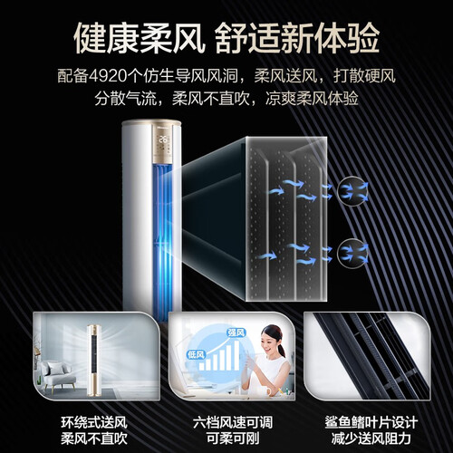 空调内置仿生导风风洞,使空调吹出细腻柔风感,提升您的舒适体验。搭配贯流风扇能有效降低空调的运行噪音,守护静谧舒适睡眠。
