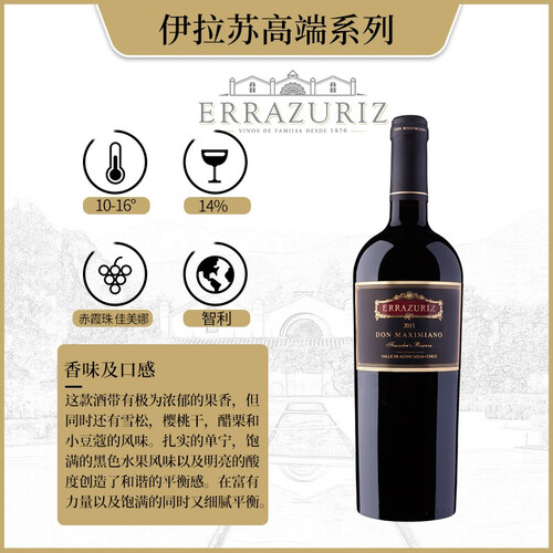 来自智利著名的中央山谷葡萄种植区,老葡萄藤酿造,所产果实风味浓郁。经过橡木桶陈酿,大师级的酿造技术,散发出迷人酒香。