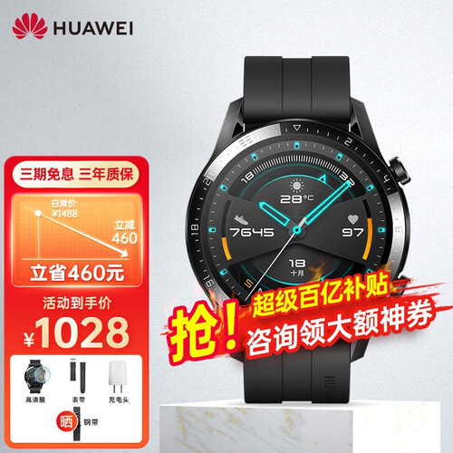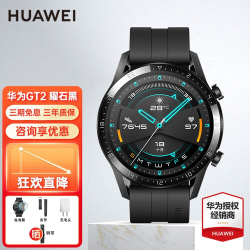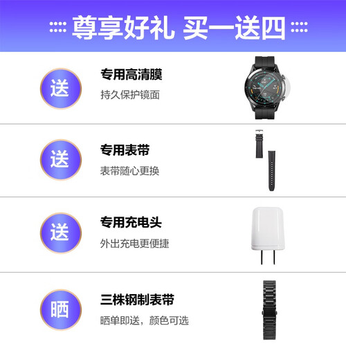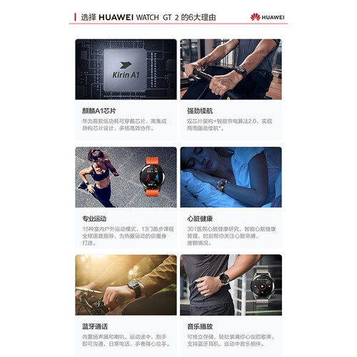 采用麒麟A1芯片,功耗更低效能更强劲;拥有两周强劲续航,佩戴无需频繁充电;具有15种运动模式,分析运动数据。