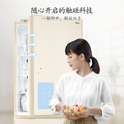 采用东芝专利触控技术,一触即开的智慧冰箱门,解放你的双手,采用光触媒抗菌除臭装置,有效避免细菌繁殖,还原冰箱清新味道。