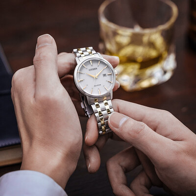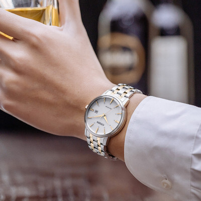 白面表盘搭配金色刻度,层次分明方便读时。三点位附带日历视窗,轻松查看日期,实用性强。螺纹表冠,调时轻松方便。