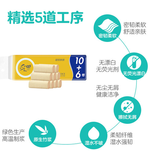 这款卷纸以原竹为原料,既环保,又具较强的韧性,使用不掉屑,湿水不易破,健康又亲肤。