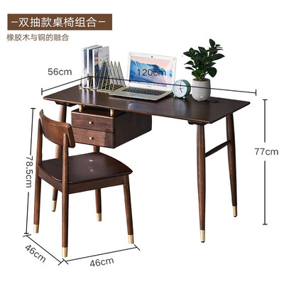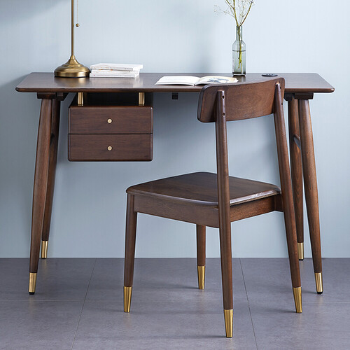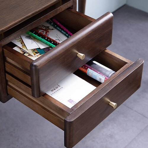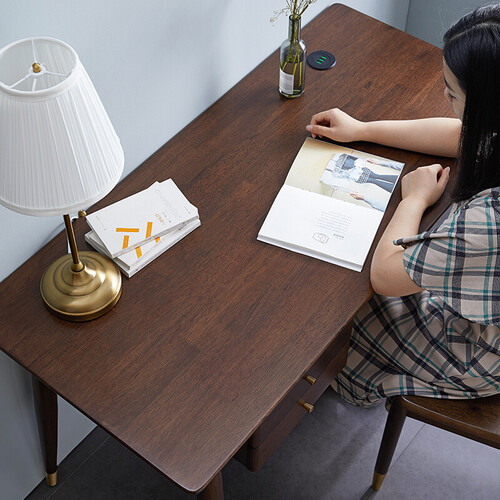 选用橡胶木,加以黄铜配件点缀,散发出轻奢美感。带有两个储物抽屉,可分类收纳物品,使桌面保持整洁。