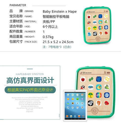 智能触控平板电脑,高度还原界面,触摸功能键能发出对应的音乐与声音。包边设计,抗摔能力强,无惧宝宝百般折磨。